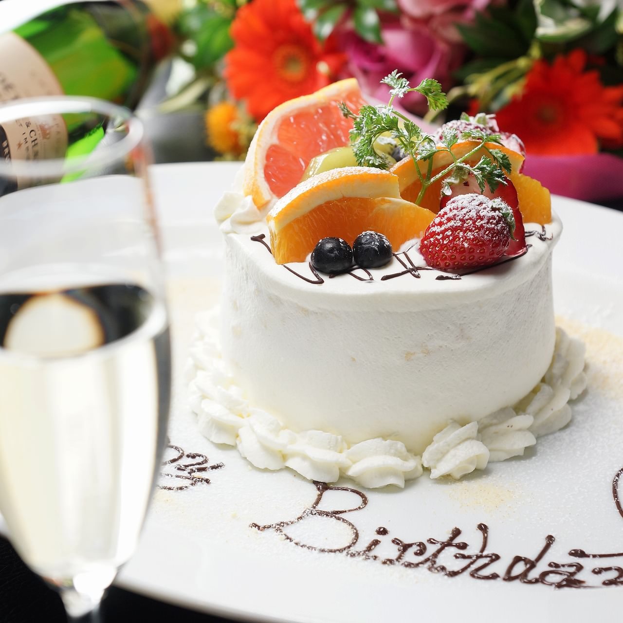 乾杯グラスシャンパン・メッセージ付きAnniversaryケーキ付き。